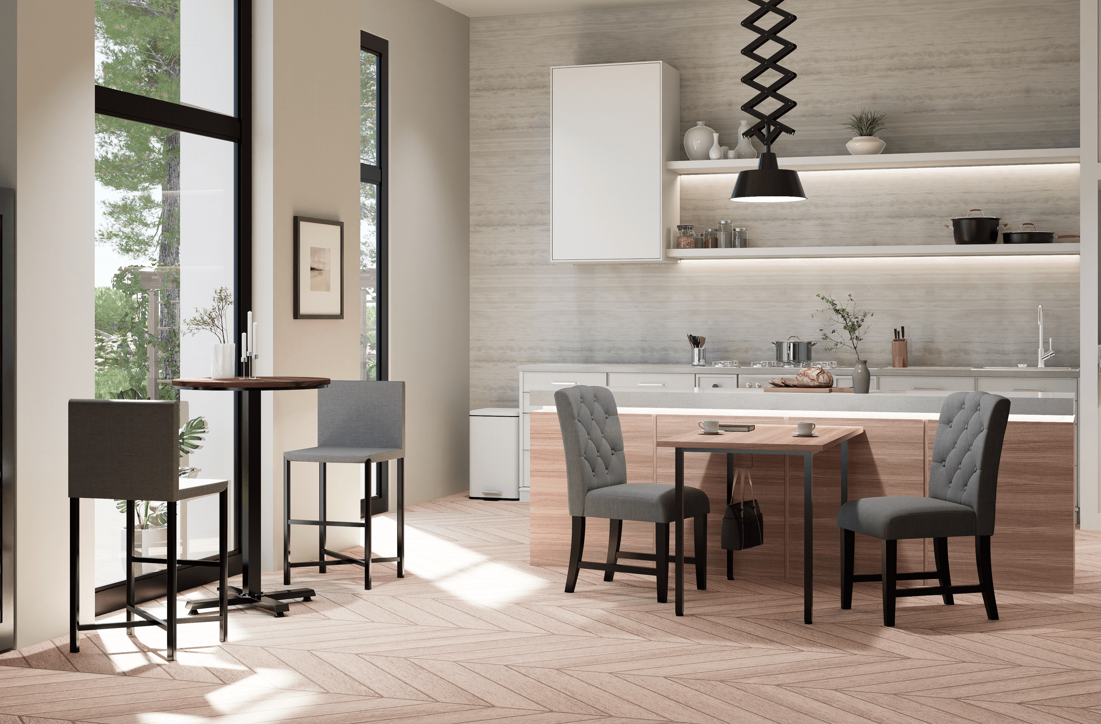 ขั้นแรกของการสร้างบรรยากาศของโฮมคาเฟ่ให้เหมือนคาเฟ่ของจริงทำได้ง่าย ๆ ด้วยการใช้เฟอร์นิเจอร์เหมือนที่ร้านกาแฟนิยมใช้กันอย่างโต๊ะบาร์และเก้าอี้บาร์ ซึ่งเหมาะสำหรับการนั่งจิบกาแฟ ทานของว่าง และสนทนากัน ลองวางโต๊ะบาร์สักตัวพร้อมเก้าอี้บาร์หนึ่งคู่ ก็ให้มุมมองเหมือนกับว่าคุณอยู่ที่ร้านกาแฟได้แล้ว นอกจากนี้โต๊ะและเก้าอี้บาร์ที่มีขายาว จะช่วยทำให้ห้องดูโปร่งมากขึ้น และยังสามารถนำไปใช้กับส่วนอื่น ๆ ได้ด้วย เช่น หากคุณมีเคาน์เตอร์ครัวที่บ้าน ก็สามารถใช้เก้าอี้บาร์ร่วมกันได้